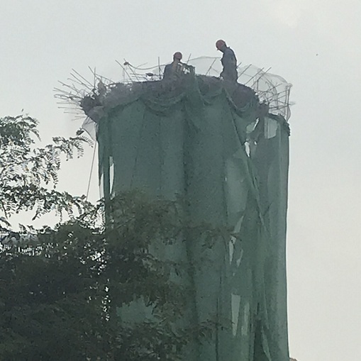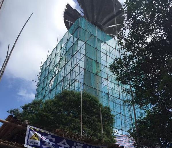 (1)搭設(shè)由地面至頂部的全封閉鋼管腳手架(高出水塔1.5米)并經(jīng)驗(yàn)收合格后,人工開始拆除,人工拆除至地面30米改用機(jī)械拆除;