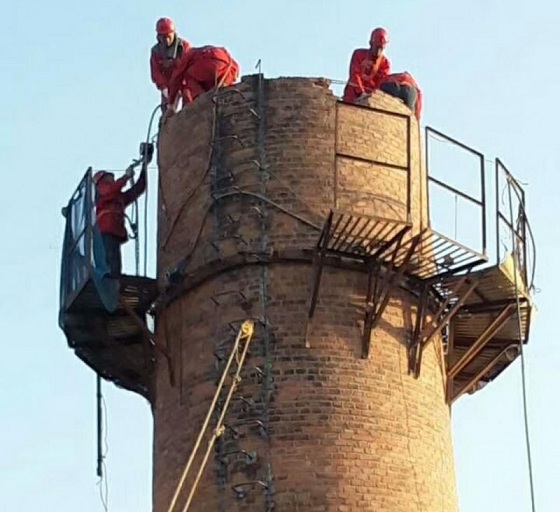 該煙囪高度60m,底部直徑6.5m,為層平臺一下以下為混凝土結(jié)構(gòu)、上部為磚砌外分結(jié)構(gòu)(十分罕見),因腐蝕嚴(yán)重,且頂口裂縫嚴(yán)重,呈大喇叭敞口狀,隨時有崩塌可能,現(xiàn)擬將上部磚結(jié)構(gòu)拆除。