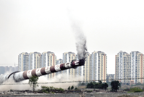 昨天上午10時(shí)8分,記者眼前一道亮光閃過,緊接著“轟隆”一聲巨響,一座150米高的煙囪和兩座90米高的冷卻塔在幾秒之內(nèi)就被384公斤炸藥摧毀,淹沒在濃濃的灰塵中。同一時(shí)間爆破這么多、這么高的冷卻塔和煙囪,在我省尚屬首例,記者在距離最近一座冷卻塔只有百米的地方,用相機(jī)記錄下這驚心動(dòng)魄的煙囪爆破瞬間。